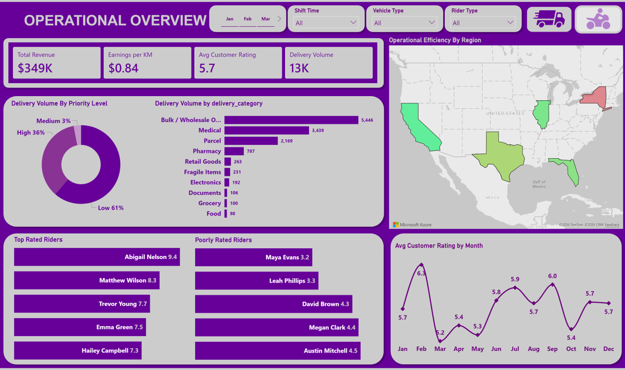 This project analyzes the rider, delivery, and operations data of a last-mile logistics and delivery platform, using Microsoft Excel and Power BI. It models and visualizes revenue, efficiency, and performance metrics across regions and riders.